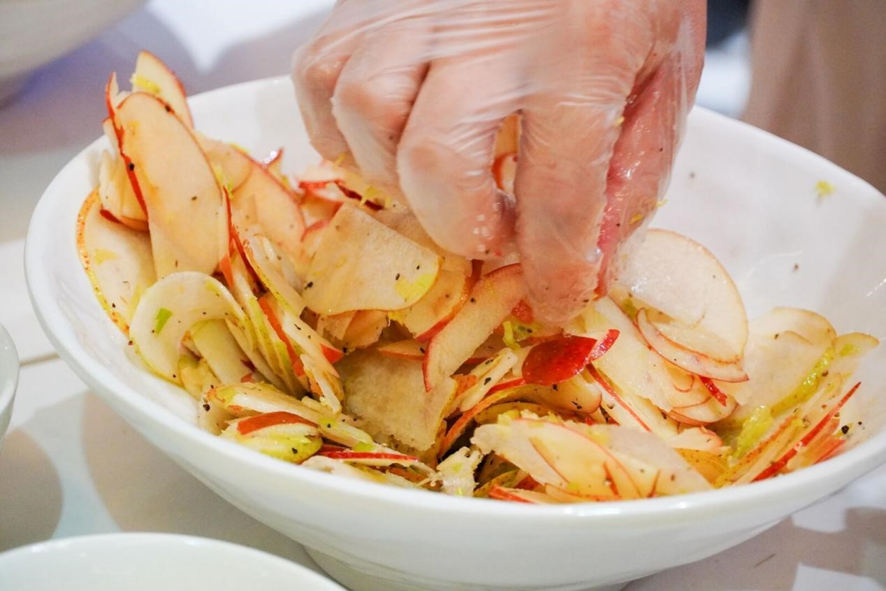 1. 将苹果,梨擦成薄片,嫩西芹叶切碎;